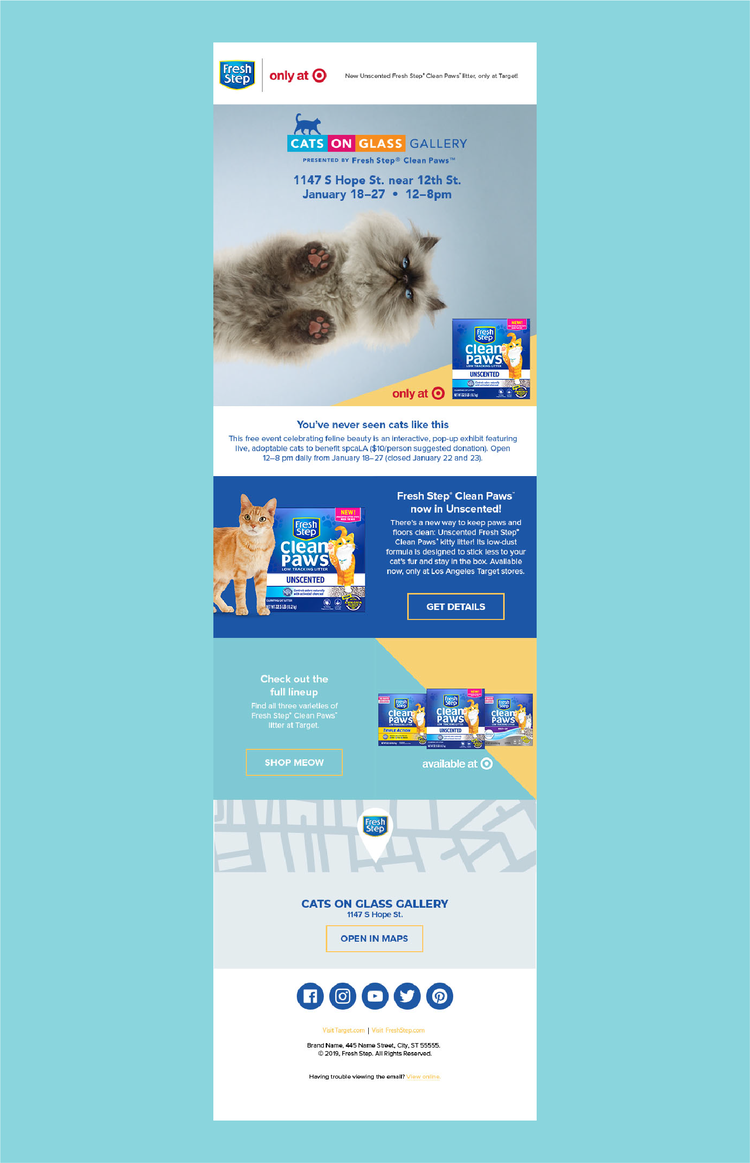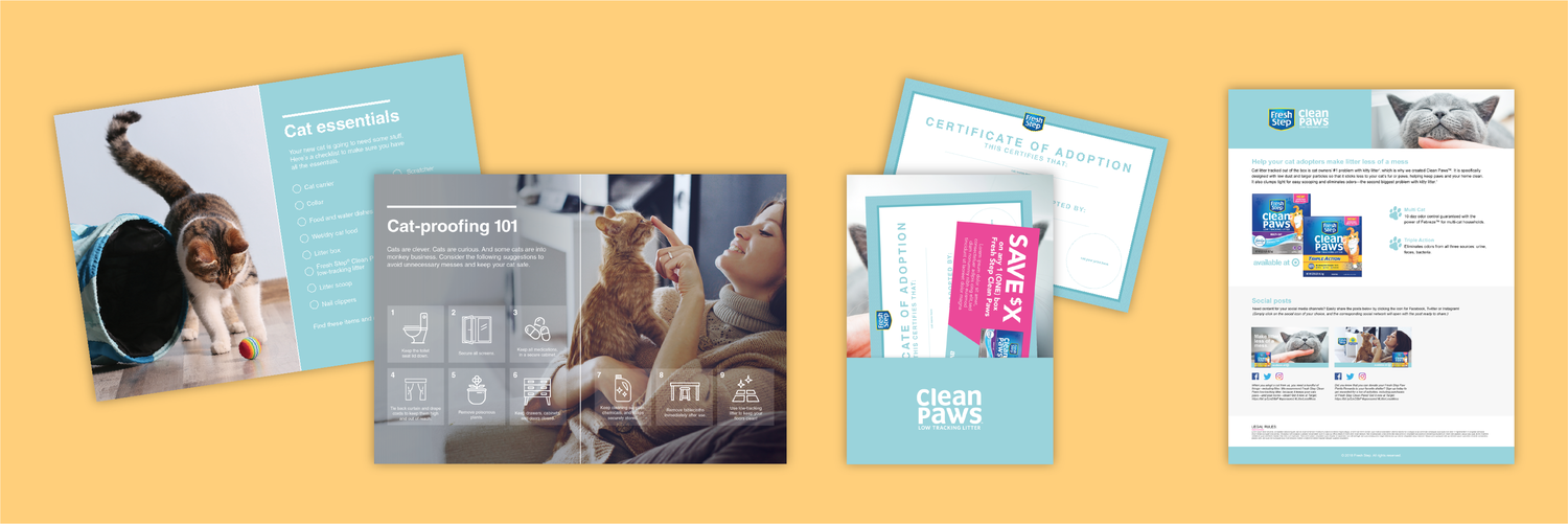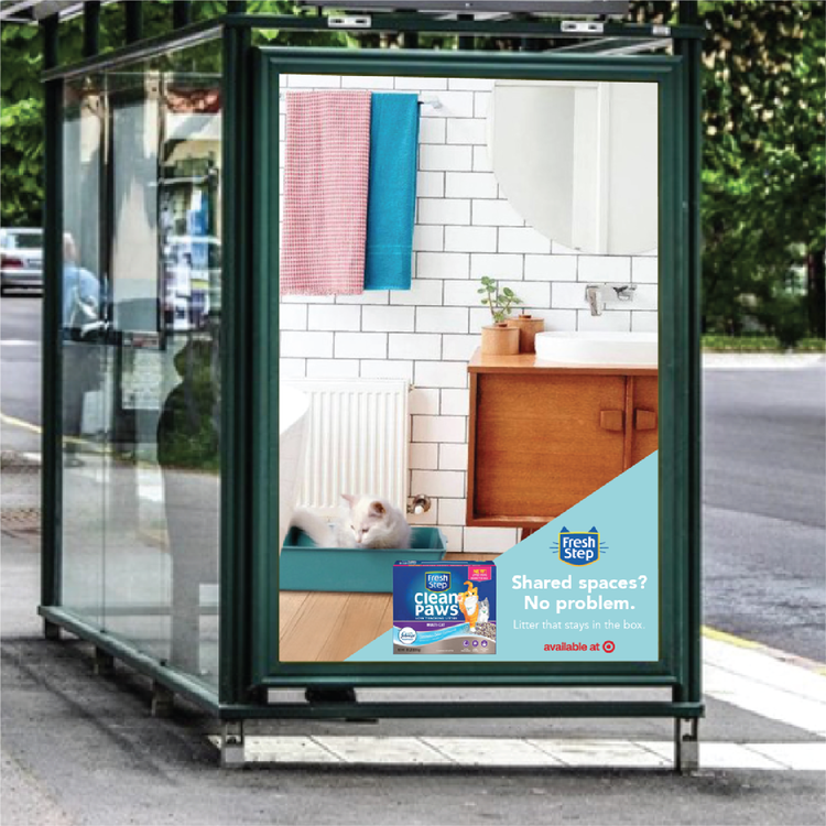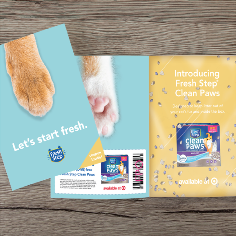 I worked with senior art director Courtney Peterson and art director Laura Rodgers on the launch of Fresh Step Clean Paws cat litter at Target, which included exclusive activation and category innovation. The plan had multiple touchpoints to drive awareness and excite the Target shoppers while also solving the consumer paint point of litter tracking.